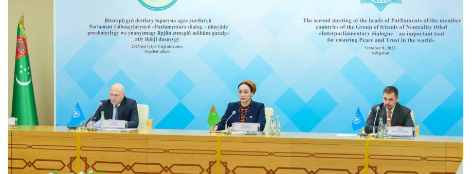 2025-nji ýylyň 8-nji oktýabrynda Türkmenistanyň Mejlisiniň binasynda «Parlamentara dialog – dünýäde parahatçylygy we ynanyşmagy üpjün etmegiň möhüm guraly» atly Bitaraplygyň dostlary toparynyň parlament ýolbaşçylarynyň ikinji duşuşygy geçirildi.